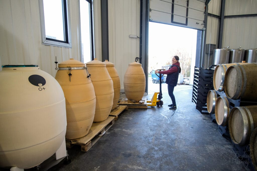 На Бейкуші ми використовуємо кілька типів ємностей. Наша Амфора Ркацителі ферментується і витримується у 400-літрових каталонських тінахас від майстерні Cantereria Josep Jornet — кожна з них виготовлена вручну. Для Арбіни ми комбінуємо бетонні амфори Drunk Turtle (для свіжого винограду) і глиняні амфори майстра Жоана Міро (для підв’яленого).